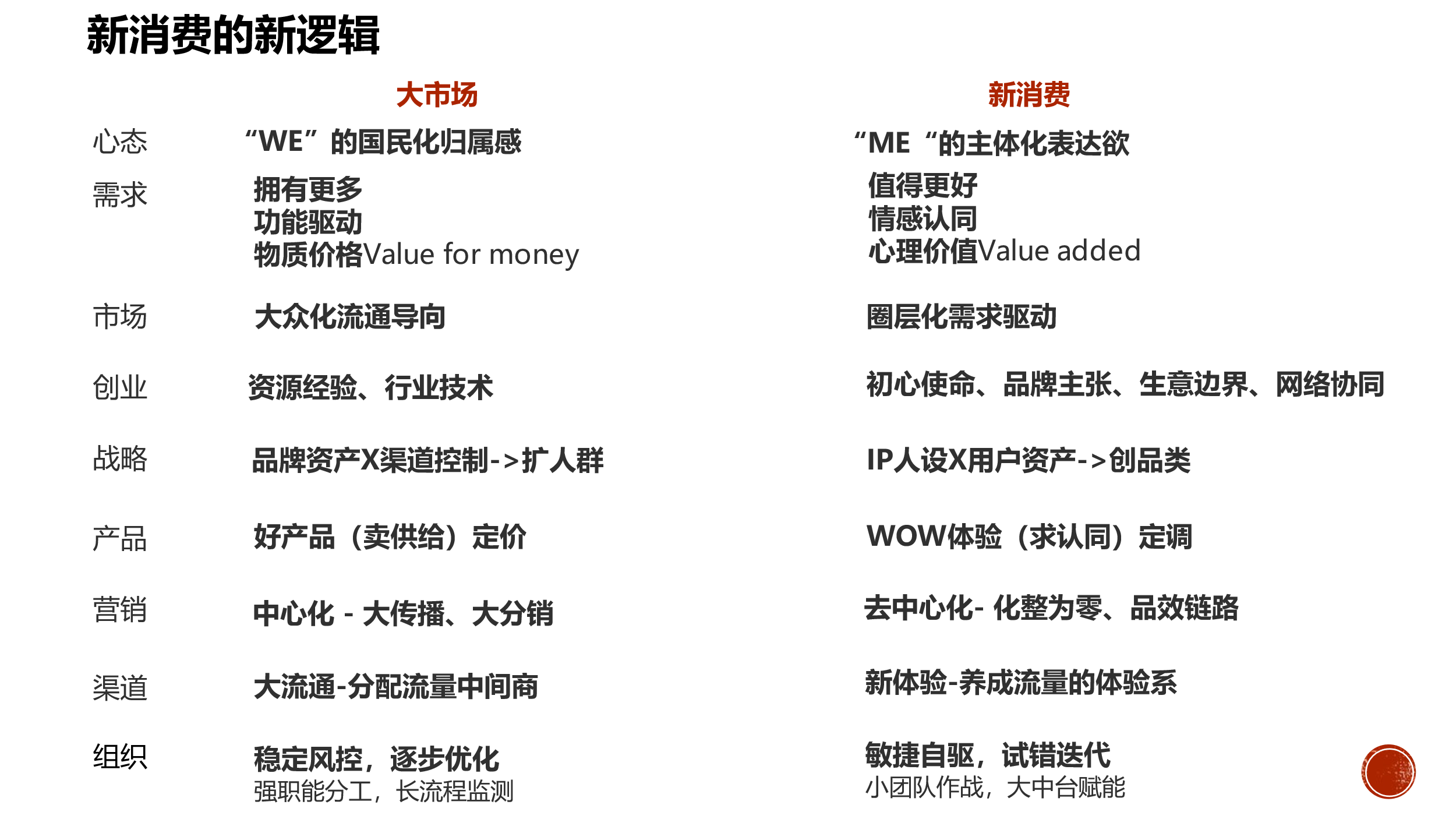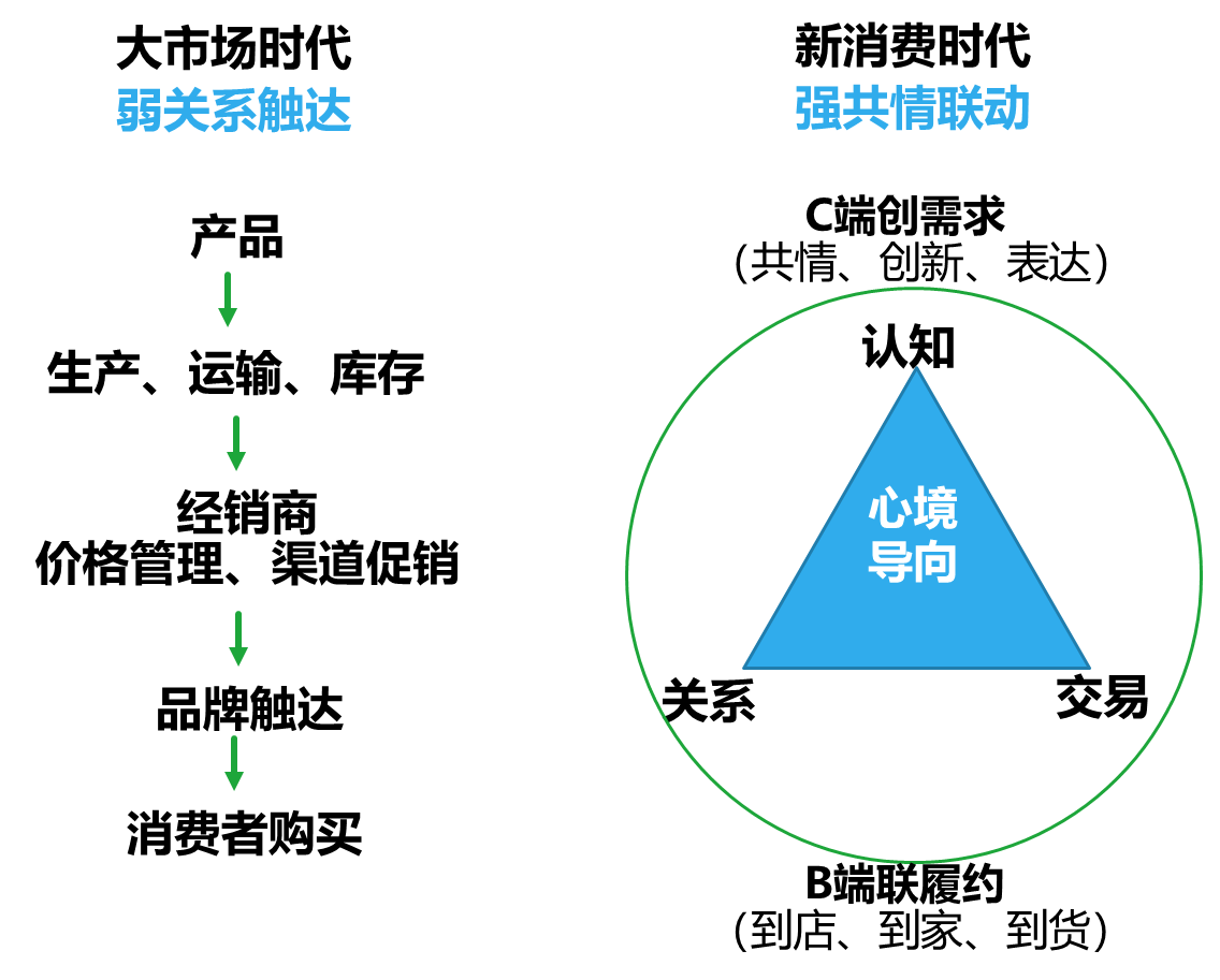 新消費和大市場在商業模式上存在底層邏輯的天壤之別。大市場時代是產品導向、渠道為王,標準增長公式為國民化大單品+洗腦化大傳播+壓貨式大分銷+流量式大出貨,本質商業邏輯是供給重于需求、貨找人的弱關系觸達。
