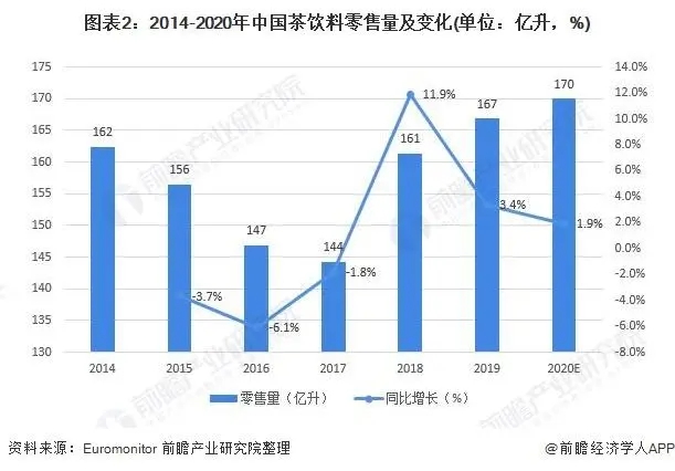 從我國茶飲料的生產(chǎn)情況來看,根據(jù)Euromonitor相關(guān)數(shù)據(jù),2014-2019年我國茶飲料零售量呈現(xiàn)先降后增的波動(dòng)趨勢(shì),2019年我國茶飲料零售量約為167億升,同比增長(zhǎng)3.4%;根據(jù)我國飲料行業(yè)整體行情初步判定,2020年中國茶飲料零售量約為170億升。