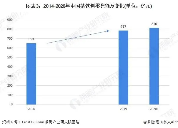 從我國茶飲料行業(yè)零售額變化情況來看,根據(jù)Frost & Sullivan統(tǒng)計(jì)數(shù)據(jù),2014-2019年間我國茶飲料零售額呈增長(zhǎng)之勢(shì),從2014年的653億元增長(zhǎng)到了2019年的787億元,年復(fù)合增長(zhǎng)率約為3.8%;按照增速預(yù)計(jì),2020年我國茶飲料零售額約為816億元。