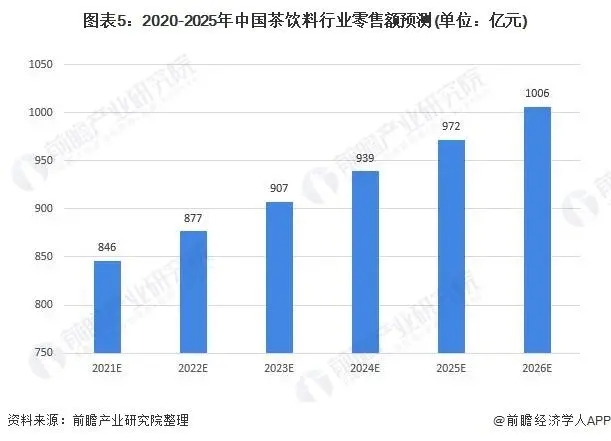 隨著中國人民生活水平及支付能力的不斷提高,人們?cè)絹碓疥P(guān)注自身的健康。茶飲料中茶的健康形象成為消費(fèi)者選購該類產(chǎn)品的一個(gè)重要?jiǎng)恿ΑnA(yù)計(jì)到2026年我國茶飲料行業(yè)零售額將達(dá)到千億元以上,約1006億元。